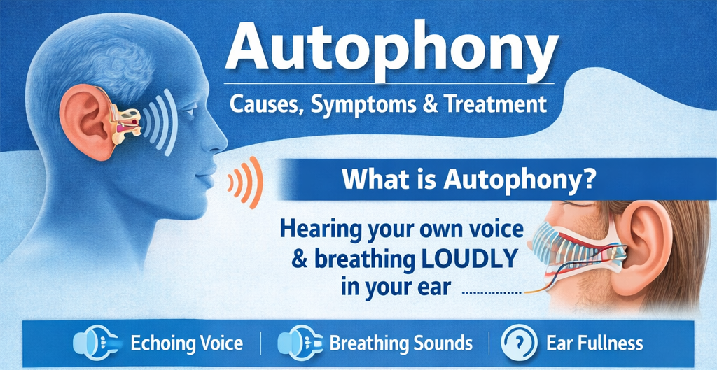 Autophony is a hearing condition where a person hears their own voice, breathing, or body sounds unusually loud inside their ear. People with autophony often describe the sensation as if their voice is echoing or booming inside their head. It can be uncomfortable and sometimes disturbing.